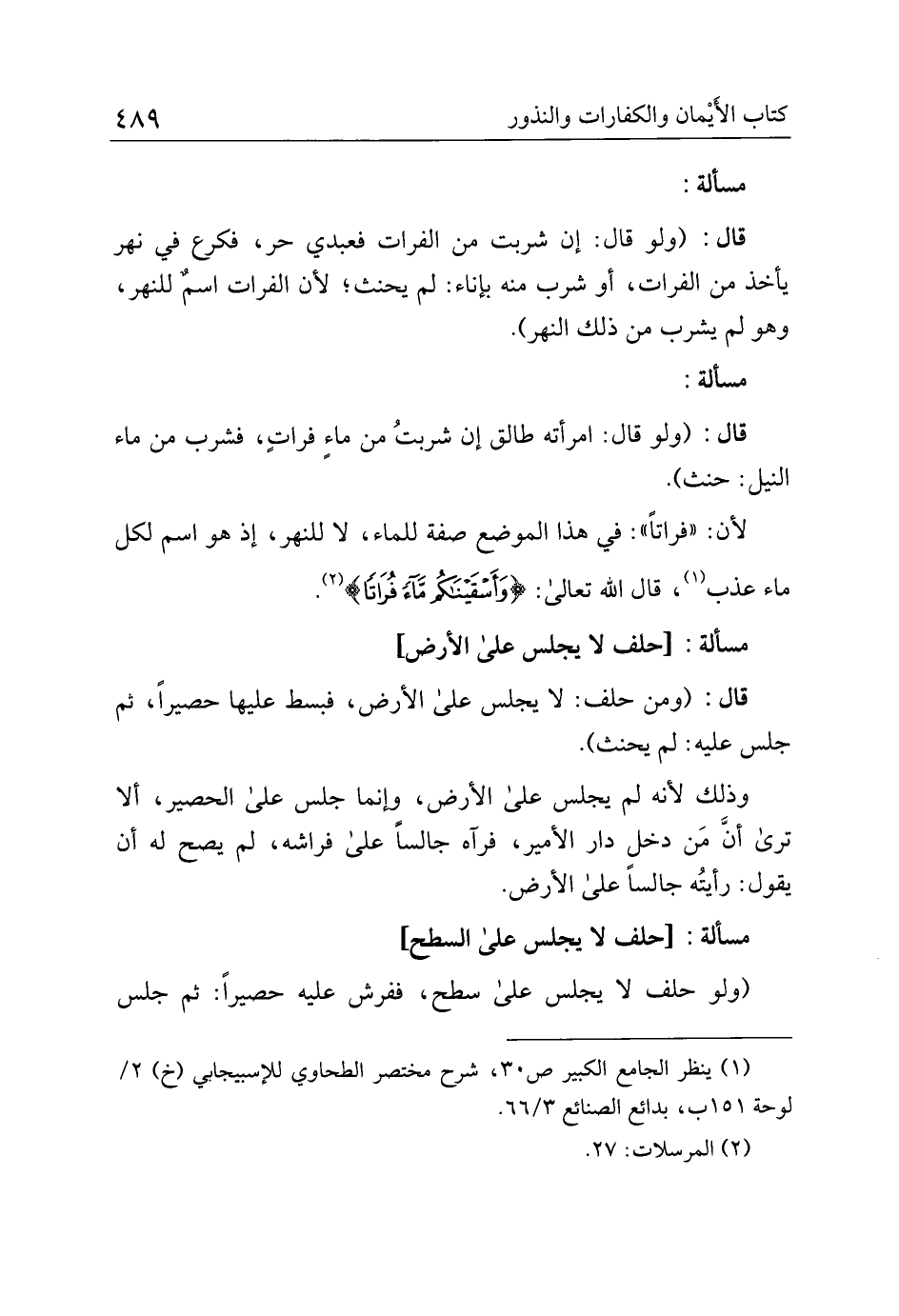 قال: (ولو قال: إن شربت من الفرات فعبدي حر، فكرع في نهر يأخذ من الفرات، أو شرب منه بإناء: لم يحنث؛ لأن الفرات اسم للنهر، وهو لم يشرب من ذلك النهر).