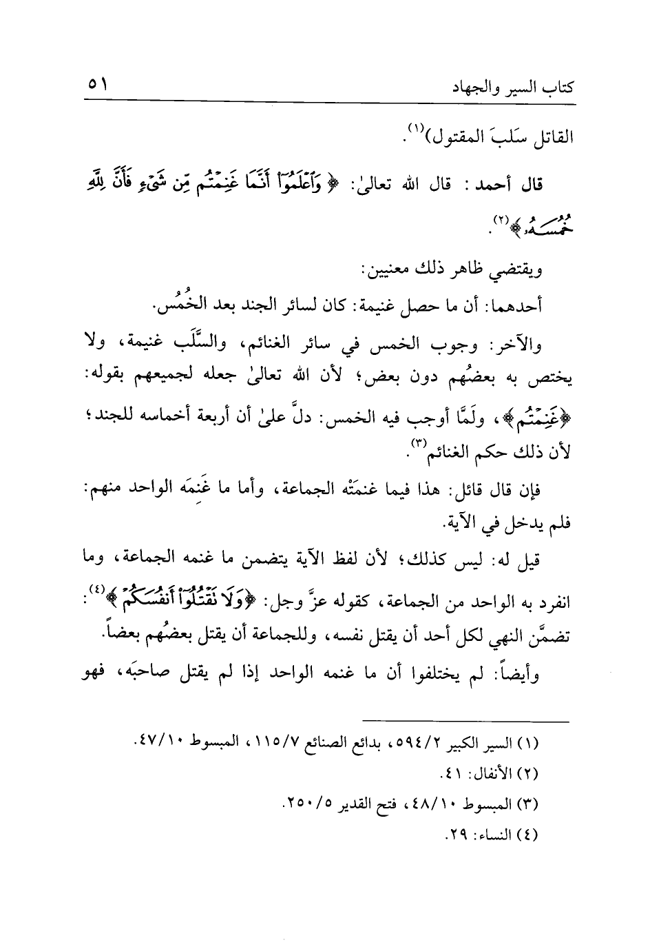 والآخر: وجوب الخمس في سائر الغنائم، والسلب غنيمة، ولا يختص به بعضهم دون بعض؛ لأن الله تعالى جعله لجميعهم بقوله: {غنمتم}، ولما أوجب فيه الخمس: دل على أن أربعة أخماسه للجند؛ لأن ذلك حكم الغنائم.