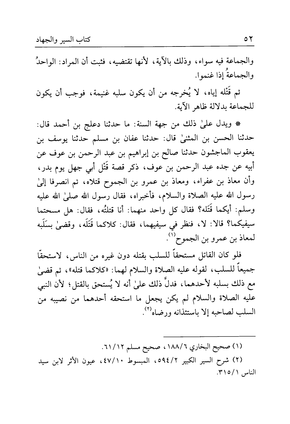 * ويدل على ذلك من جهة السنة: ما حدثنا دعلج بن أحمد قال: حدثنا الحسن بن المثني قال: حدثنا عفان بن مسلم حدثنا يوسف بن يعقوب الماجشون حدثنا صالح بن إبراهيم بن عبد الرحمن بن عوف عن أبيه عن جده عبد الرحمن بن عوف، ذكر قصة قتل أبي جهل يوم بدر، وأن معاذ بن عفراء، ومعاذ بن عمرو بن الجموح قتلاه، ثم انصرفا إلى رسول الله عليه الصلاة والسلام، فاخبراه، فقال رسول الله صلى الله عليه وسلم: أيكما قتله؟ فقال كل واحد منهما: أنا قتلته، فقال: هل مسحتما سيفيكما؟ قالا: لا، فنظر في سيفيهما، فقال: كلاكما قتله، وقضى بسلبه لمعاذ بن عمرو بن الجموح.