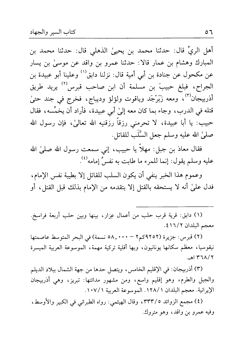 أهل الري قال: حدثنا محمد بن يحيى الذهلي قال: حدثنا محمد بن المبارك وهشام بن عمار قالا: حدثنا عمرو بن واقد عن موسى بن يسار عن مكحول عن جنادة بن أبي أمية قال: نزلنا دابق وعلينا أبو عبيدة بن الجراح فبلغ حبيب بن مسلمة أن ابن صاحب قبرس يريد طريق أذربيجان، ومعه زبرجد وياقوت ولؤلؤ وديباج، فخرج في جند حتى قتله في الدرب، وجاء بما كان معه إلى أبي عبيدة، فأراد أن يخمسه، فقال حبيب: يا أبا عبيدة، لا تحرمني رزقًا رزقنيه الله تعالى، فإن رسول الله صلى الله عليه وسلم جعل السلب للقاتل.