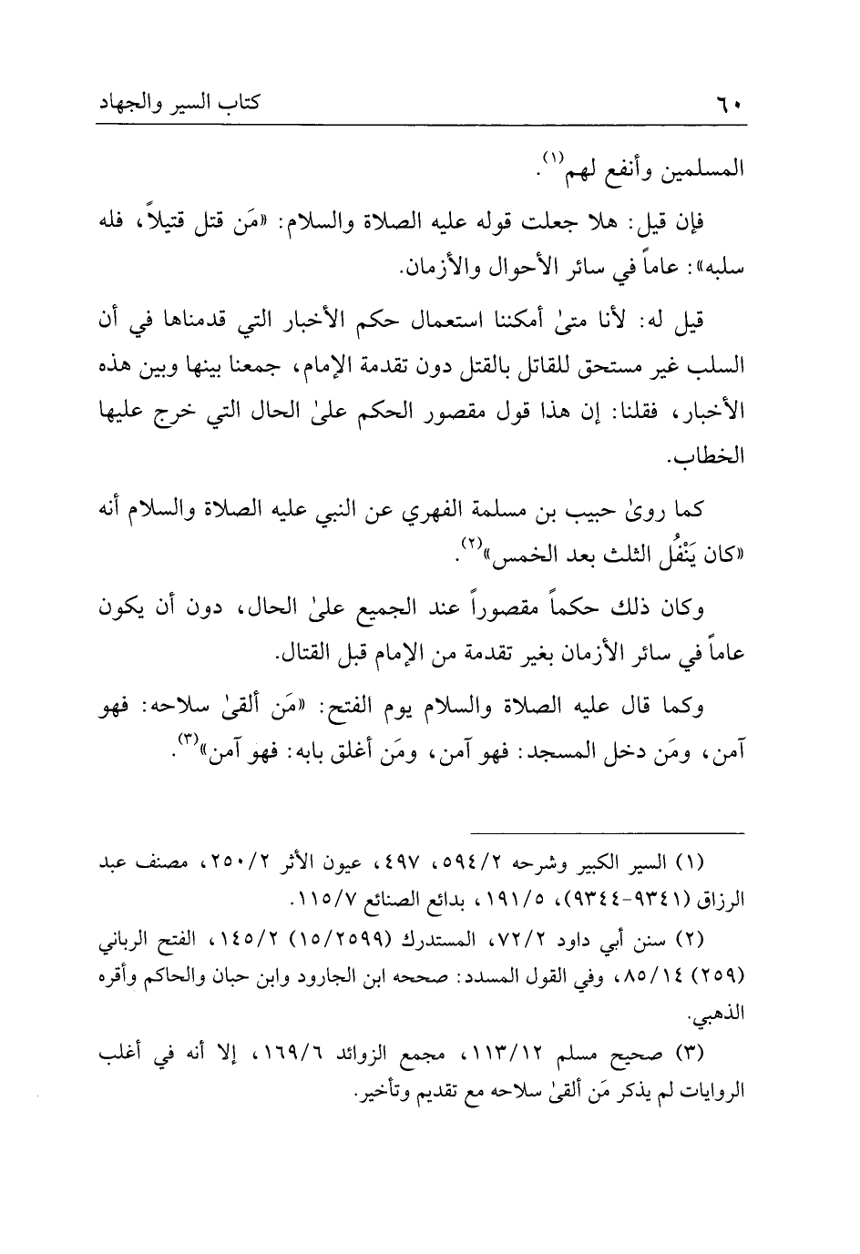 قيل له: لأنا متى أمكننا استعمال حكم الأخبار التي قدمناها في أن السلب غير مستحق للقاتل بالقتل دون تقدمة الإمام، جمعنا بينها وبين هذه الأخبار، فقلنا: إن هذا القول مقصور الحكم على الحال التي خرج عليها الخطاب.