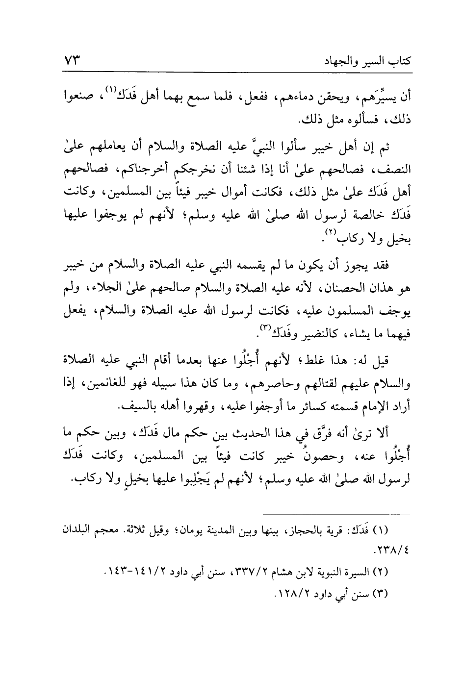 ألا ترى أنه فرق في هذا الحديث بين حكم مال فدك، وبين حكم ما أجلوا عنه، وحصون خيبر كانت فيئًا بين المسلمين، وكانت فدك لرسول الله صلى الله عليه وسلم؛ لأنهم لم يجلبوا عليها بخيٍل ولا ركاب.