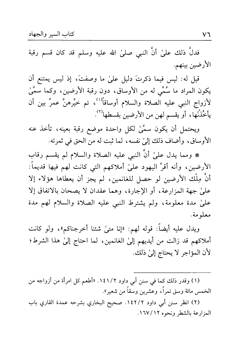 * ومما يدل على أن النبي عليه الصلاة والسلام لم يقسم رقاب الأرضين، وأنه أقر اليهود على أملاكهم التي كانت لهم فيها قديمًا: أن ملك الأرضين لو حصل للغانمين، لم يجز أن يعطاها هؤلاء إلا على جهة المزارعة، أو الإجارة، وهما عقدان لا يصحان بالاتفاق إلا على مدة معلومة، ولم يشترط النبي عليه الصلاة والسلام لهم مدة معلومة.