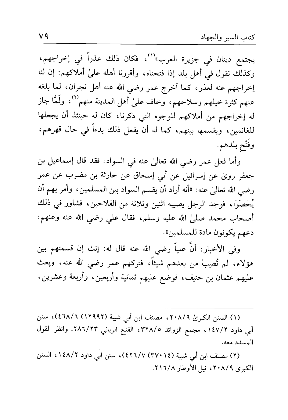 وإما فعل عمر رضي الله تعالى عنه في السواد: فقد قال إسماعيل بن جعفر روى عن إسرائيل عن أبي إسحاق عن حارثة بن مضرب عن عمر رضي الله تعالى عنه: "أنه أراد أن يقسم السواد بين المسلمين، وأمر بهم أن يحصوا، فوجد الرجل يصيبه اثنين وثلاثة من الفلاحين، فشاور في ذلك أصحاب محمد صلى الله عليه وسلم، فقال علي رضي الله عنه وعنهم: دعهم يكونون مادة للمسلمين".