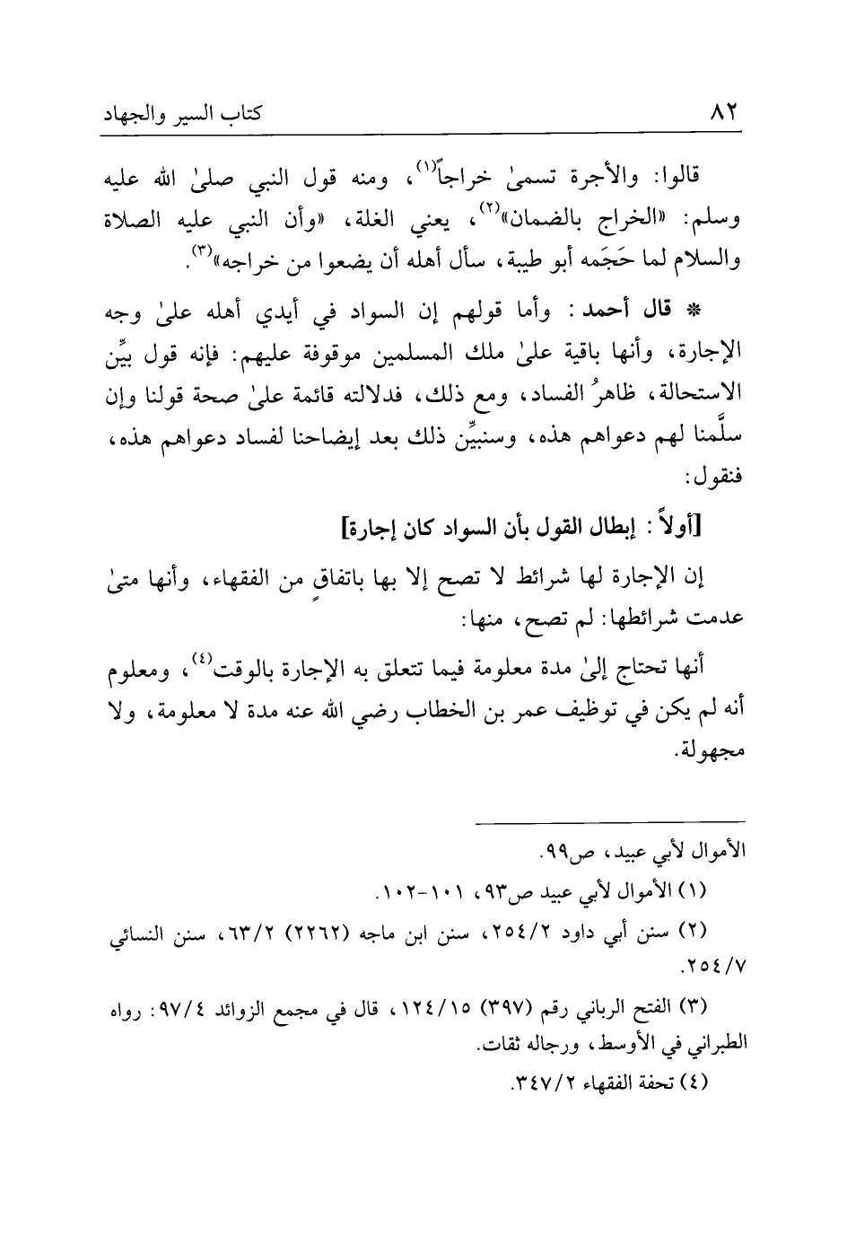 * قال أحمد: وأما قولهم إن السواد في أيدي أهله على وجه الإجارة، وأنها باقية على ملك المسلمين موقوفة عليهم: فإنه قول بين الاستحالة، ظاهر الفساد، ومع ذلك، فدلالته قائمة على صحة قولنا وإن سلمنا لهم دعواهم هذه، وسنبين ذلك بعد إيضاحنا لفساد دعواهم هذه، فنقول: