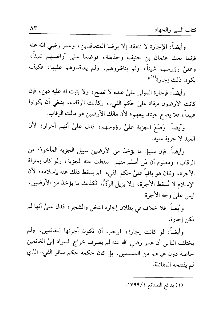 وأيضًا: الإجارة لا تنعقد غلا برضا المتعاقدين، وعمر رضي اله عنه فإنما بعث عثمان بن حنيف وحذيفة، فوضعا على أراضيهم شيئًا، وعلى رؤوسهم شيئًا، ولم يناظروهم، ولم يعاقدوهم عليها، فكيف يكون ذلك إجازة؟.
