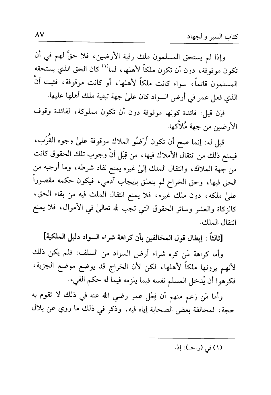وإذا لم يستحق المسلمون ملك رقبة الأرضين، فلا حق لهم في أن تكون موقوفة، دون أن تكون ملكًا لأهلها، لما كان الحق الذي يستحقه المسلمون قائمًا، سواء كانت ملكًا لأهلها، أو كانت موقوفة، فثبت أن الذي فعل عمر في أرض السواد على جهة تبقية ملك أهلها عليها.
