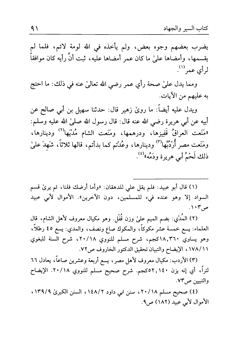ويدل عليه أيضًا: ما روى زهير قال: حدثنا سهيل بن أبي صالح عن أبيه عن أبي هريرة رضي الله عنه قال: قال رسول الله صلى الله عليه وسلم: "منعت العراق قفيزها، ودرهمها، ومنعت الشام مديها ودينارها، ومنعت مصر أردبها ودينارها، وعدتكم كما بدأتم، قالها ثلاثًا، شهد على ذلك لحم أبي هريرة ودمه".