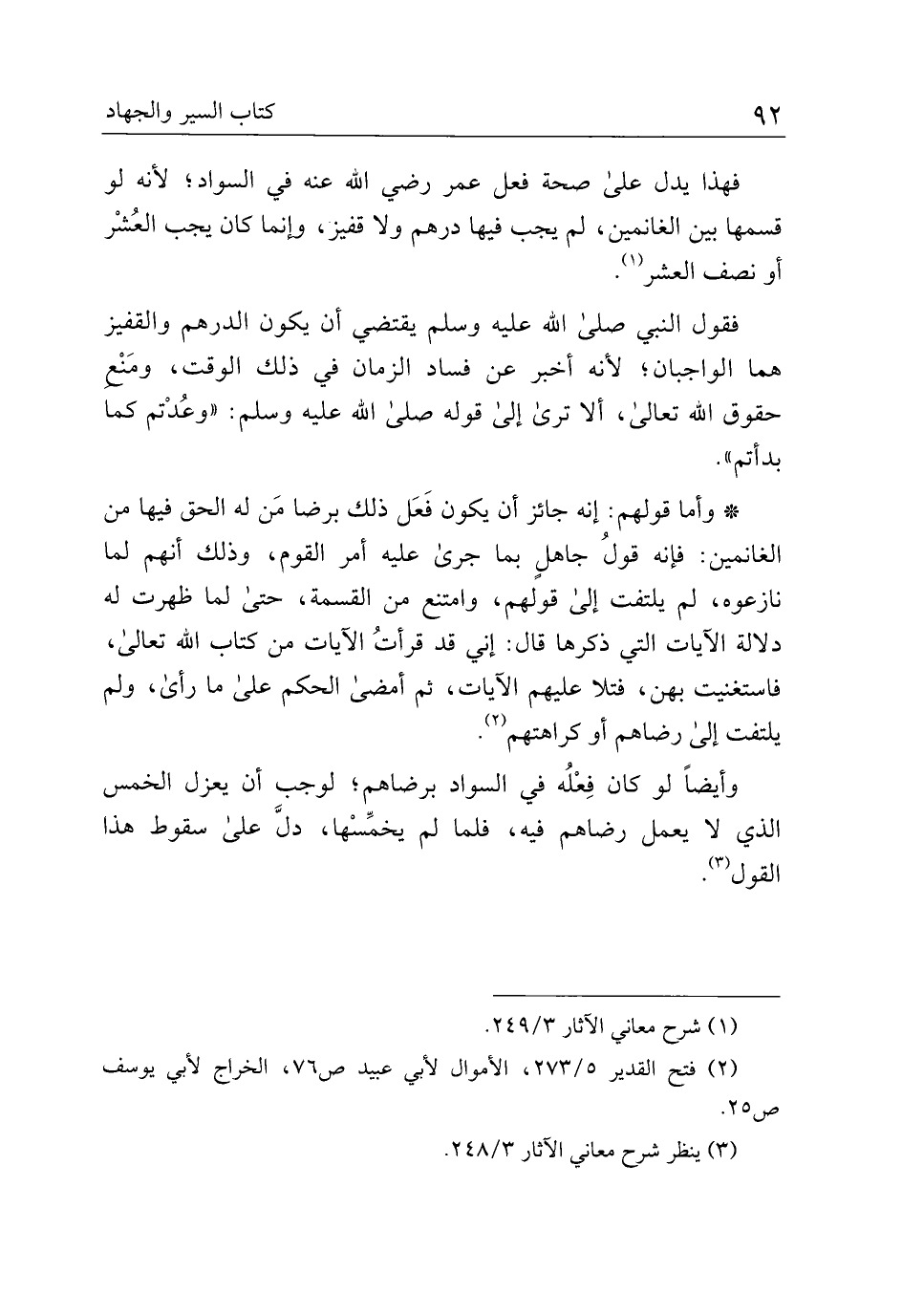 فهذا يدل على صحة فعل عمر رضي الله عنه في السواد، لأنه لو قسمها بين الغانمين، لم يجب فيها درهم ولا قفيز، وإنما كان يجب العشر أو نصف العشر.