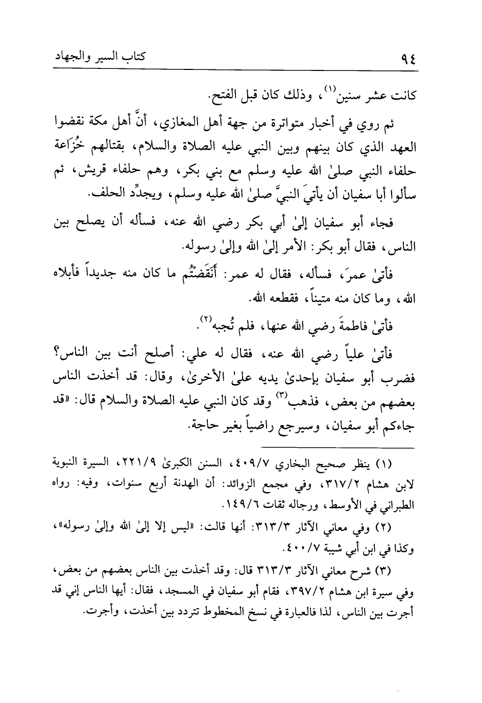 ثم روي في أخبار متواترة من جهة أهل المغازي، أن أهل مكة نقضوا العهد الذي كان بينهم وبين النبي عليه الصلاة والسلام، بقتالهم خزاعة حلفاء النبي صلى الله عليه وسلم مع بني بكر، وهم خلفاء قريش، ثم سألوا أبا سفيان أن يأتي النبي صلى الله عليه وسلم، ويجدد الحلف.