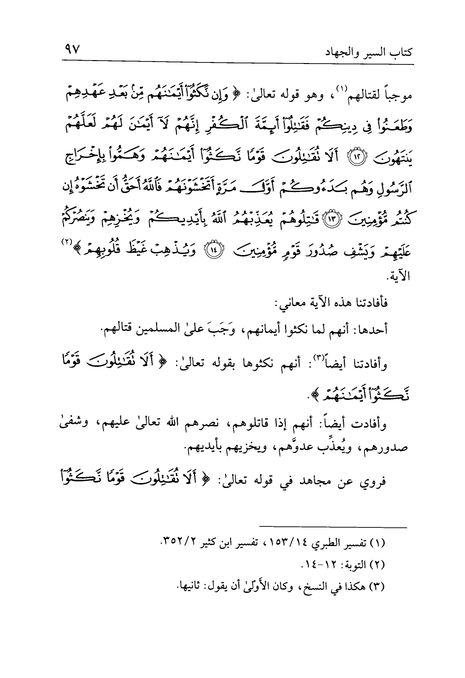 موجبًا لقتالهم، وهو قوله تعالى:} وإن نكثوا أيمانهم من بعد عهدهم طعنوا في دينكم فقاتلوا أئمة الكفر إنهم لا أين لهم لعلهم ينتهون * ألا تقتلون قوما نكثوا أيمانهم وهنوا بإخراج الرسول وهم بدءوكم أول مرة أتخشونهم فالله أحق أن تخشوه إن كنتم مؤمنين* قاتلوهم يعذبهم الله بأيديكم ويخزهم وينصركم عليهم ويشف صدور قوم مؤمنين* ويذهب غيظ قلوبهم {.