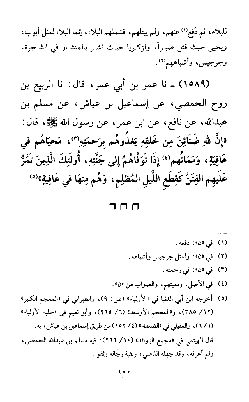 1589 - نا عمر بن أبي عمر، قال: نا الربيع بن روح الحمصي، عن إسماعيل بن عياش، عن مسلم بن عبد الله، عن نافع، عن ابن عمر، عن رسول الله صلى الله عليه وسلم، قال: ((إن لله ضنائن من خلقه يغذوهم برحمته، محياهم في عافيةٍ، ومماتهم إذا توفاهم إلى جنته، أولئك الذين تمر عليهم الفتن كقطع الليل المظلم، وهم منها في عافيةٍ)).