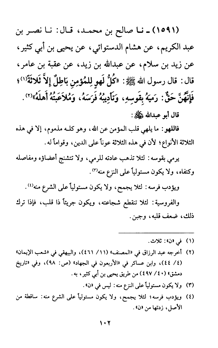 1591 - نا صالح بن محمد، قال: نا نصر بن عبد الكريم، عن هشام الدستوائي، عن يحيى بن أبي كثير، عن زيد بن سلام، عن عبد الله بن زيد، عن عقبة بن عامر، قال: قال رسول الله صلى الله عليه وسلم: ((كل لهوٍ للمؤمن باطلٌ إلا ثلاثةً؛ فإنهن حقٌّ: رميه بقوسه، وتأديبه فرسه، وملاعبته أهله)).