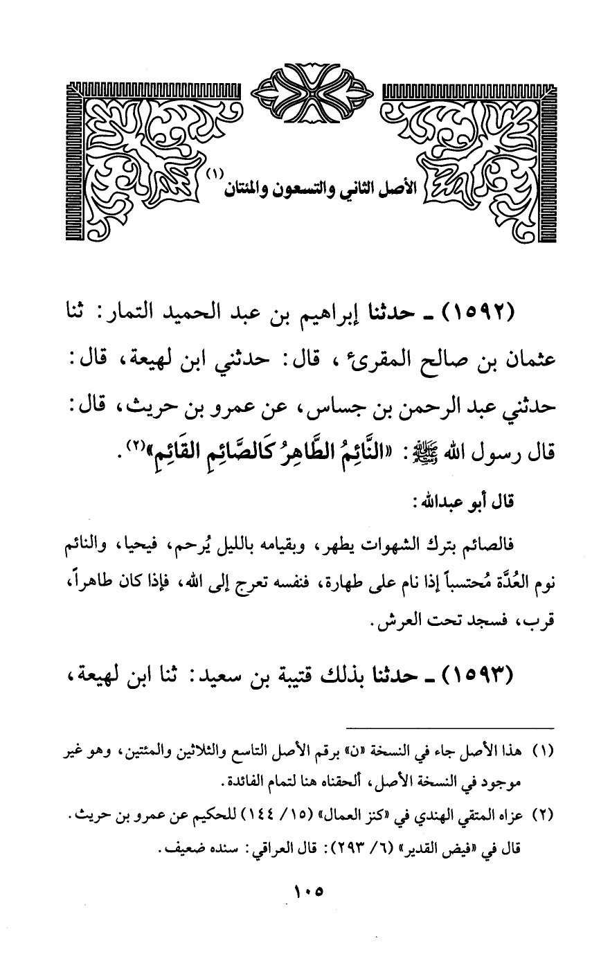 1592 - حدثنا إبراهيم بن عبد الحميد التمار: ثنا عثمان بن صالح المقرئ، قال: حدثني ابن لهيعة، قال: حدثني عبد الرحمن بن جساس، عن عمرو بن حريث، قال: قال رسول الله صلى الله عليه وسلم: ((النائم الطاهر كالصائم القائم)).
