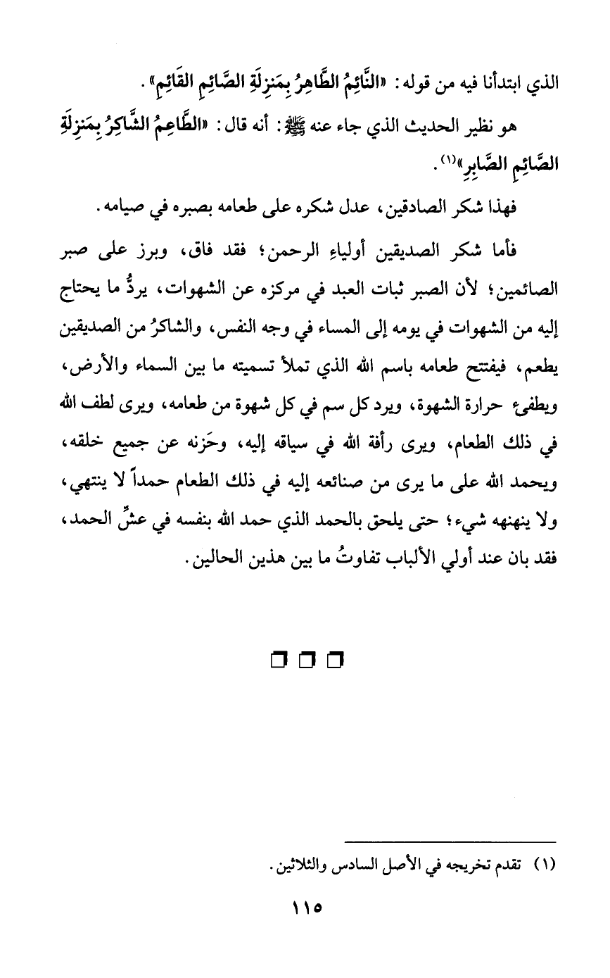 فأما شكر الصديقين أولياء الرحمن؛ فقد فاق، وبرز على صبر الصائمين؛ لأن الصبر ثبات العبد في مركزه عن الشهوات، يرد ما يحتاج إليه من الشهوات في يومه إلى المساء في وجه النفس، والشاكر من الصديقين يطعم، فيفتتح طعامه باسم الله الذي تملأ تسميته ما بين السماء والأرض، ويطفئ حرارة الشهوة، ويرد كل سم في كل شهوة من طعامه، ويرى لطف الله في ذلك الطعام، ويرى رأفة الله في سياقه إليه، وحزنه عن جميع خلقه، ويحمد الله على ما يرى من صنائعه إليه في ذلك الطعام حمداً لا ينتهي، ولا ينهنهه شيء؛ حتى يلحق بالحمد الذي حمد الله بنفسه في عش الحمد، فقد بان عند أولي الألباب تفاوت ما بين هذين الحالين.