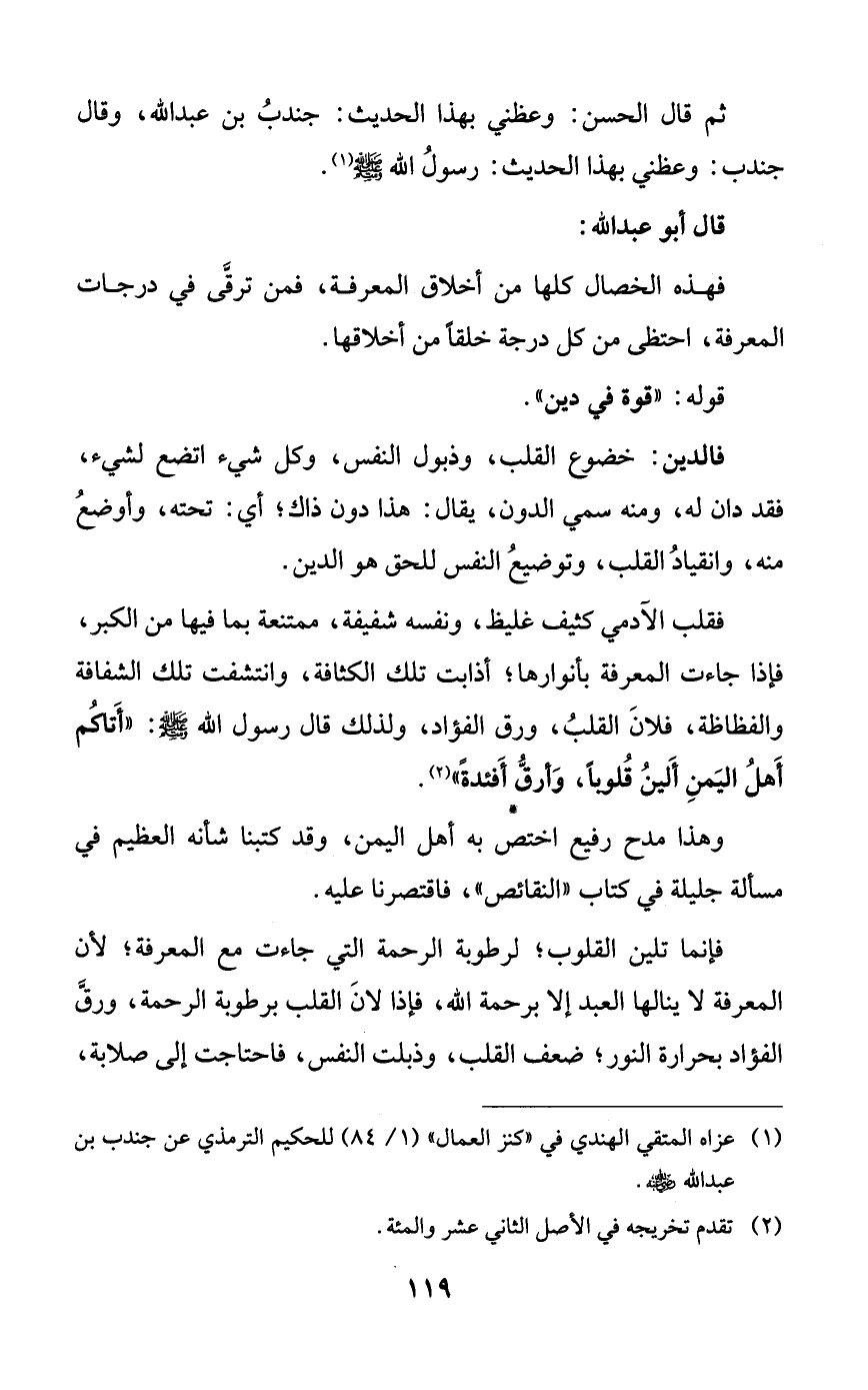 فقلب الآدمي كثيف غليظ، ونفسه شفيفة، ممتنعة بما فيها من الكبر، فإذا جاءت المعرفة بأنوارها؛ أذابت تلك الكثافة، وانتشفت تلك الشفافة والفظاظة، فلان القلب، ورق الفؤاد، ولذلك قال رسول الله صلى الله عليه وسلم: ((أتاكم أهل اليمن ألين قلوباً، وأرق أفئدةً)).