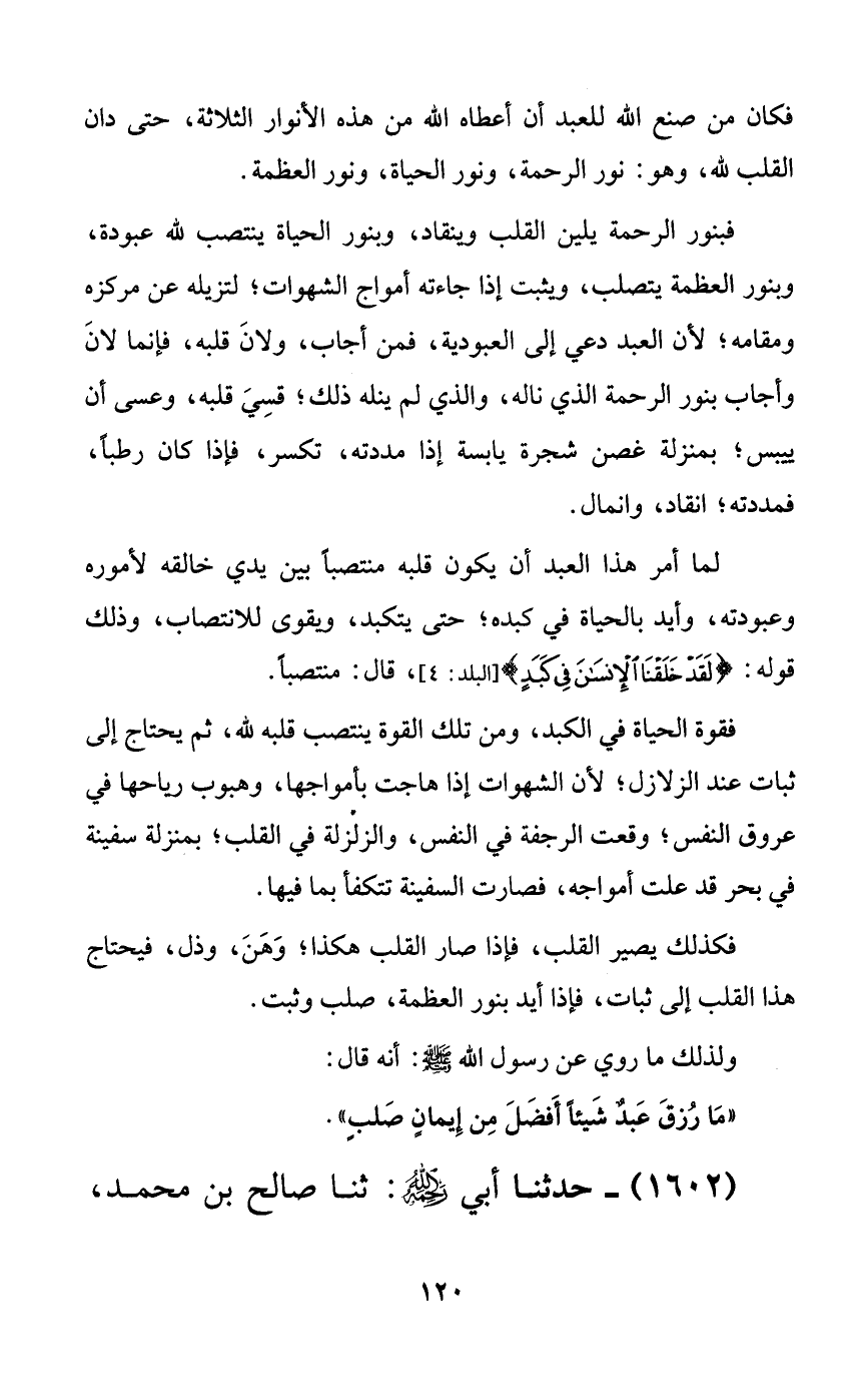 فكان من صنع الله للعبد أن أعطاه الله من هذه الأنوار الثلاثة، حتى دان القلب لله، وهو: نور الرحمة، ونور الحياة، ونور العظمة.