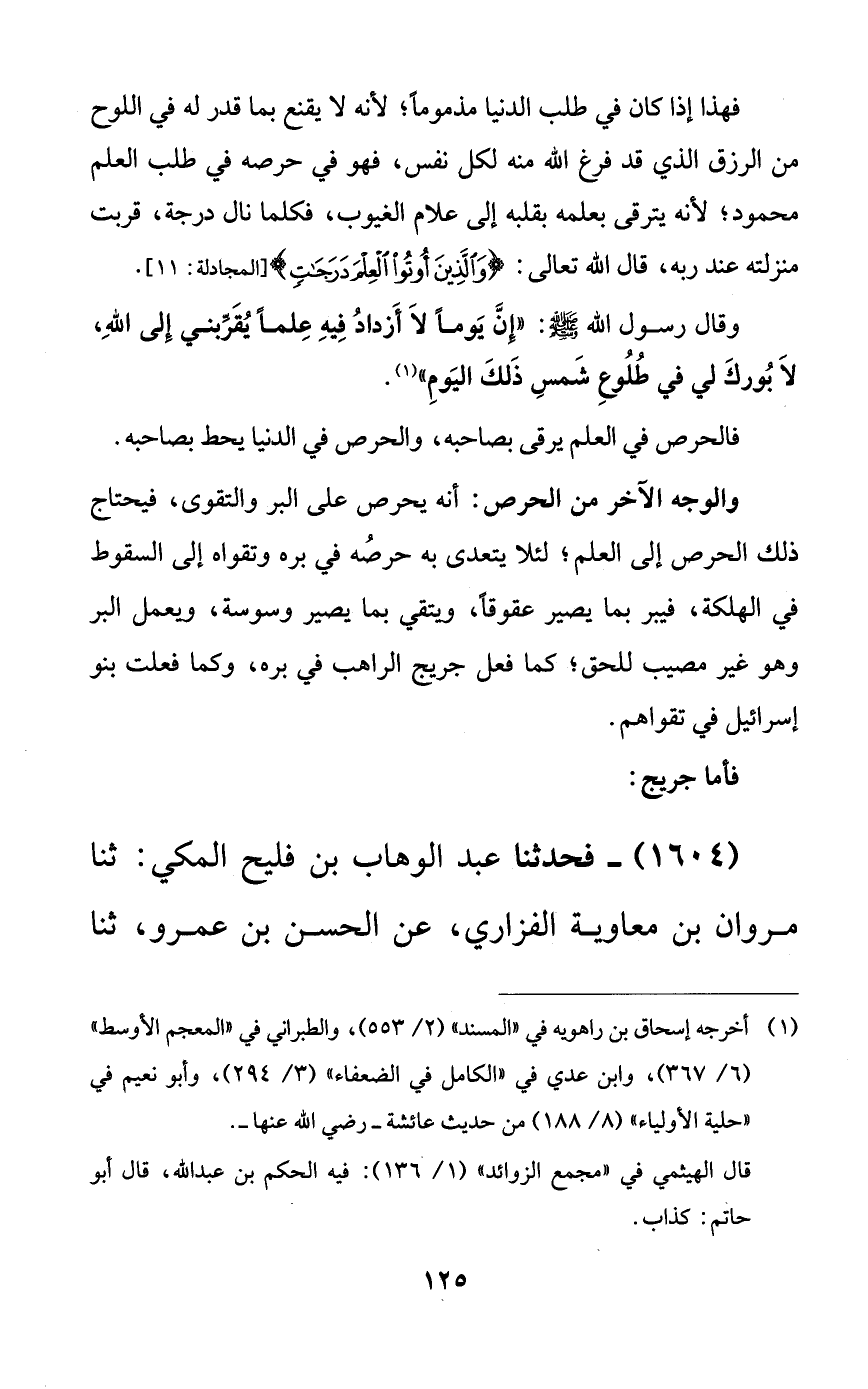 فهذا إذا كان في طلب الدنيا مذموماً؛ لأنه لا يقنع بما قدر له في اللوح من الرزق الذي قد فرغ الله منه لكل نفس، فهو في حرصه في طلب العلم محمود؛ لأنه يترقى بعلمه بقلبه إلى علام الغيوب، فكلما نال درجة، قربت منزلته عند ربه، قال الله تعالى: {والذين أوتوا العلم درجاتٍ}.
