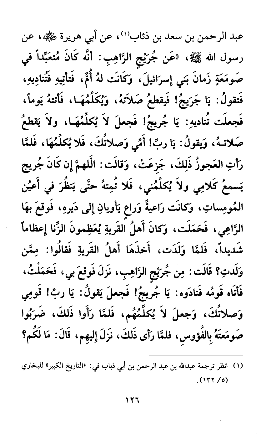 عبد الرحمن بن سعد بن ذئاب، عن أبي هريرة رضي الله عنه، عن رسول الله صلى الله عليه وسلم، ((عن جريجٍ الراهب: أنه كان متعبداً في صومعةٍ زمان بني إسرائيل، وكانت له أمٌّ، فتأتيه فتناديه، فتقول: يا جريج! فيقطع صلاته، ويكلمها، فأتته يوماً، فجعلت تناديه: يا جريج! فجعل لا يكلمها، ولا يقطع صلاته، ويقول: يا رب! أمي وصلاتك، فلا يكلمها، فلما رأت العجوز ذلك، جزعت، وقالت: اللهم إن كان جريج يسمع كلامي ولا يكلمني، فلا تمته حتى ينظر في أعين المومسات، وكانت راعيةٌ وراعٍ يأويان إلى ديره، فوقع بها الراعي، فحملت، وكان أهل القرية يعظمون الزنا إعظاماً شديداً، فلما ولدت، أخذها أهل القرية فقالوا: ممن ولدت؟ قالت: من جريجٍ الراهب، نزل فوقع بي، فحملت، فأتاه قومه فنادوه: يا جريج! فجعل يقول: يا رب! قومي وصلاتك، وجعل لا يكلمهم، فلما رأوا ذلك، ضربوا صومعته بالفؤوس، فلما رأى ذلك، نزل إليهم، قال: ما لكم؟