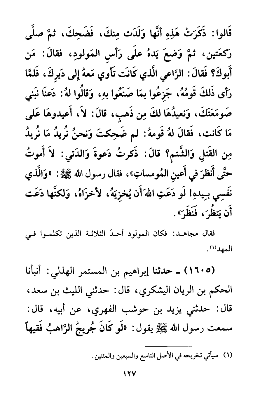 قالوا: ذكرت هذه أنها ولدت منك، فضحك، ثم صلى ركعتين، ثم وضع يده على رأس المولود، فقال: من أبوك؟ فقال: الراعي الذي كانت تأوي معه إلى ديرك، فلما رأى ذلك قومه، جزعوا بما صنعوا به، وقالوا له: دعنا نبني صومعتك، ونعيدها لك من ذهبٍ، قال: لا، أعيدوها على ما كانت، فقال له قومه: لم ضحكت ونحن نريد ما نريد من القتل والشتم؟ قال: ذكرت دعوة والدتي: لا أموت حتى أنظر في أعين المومسات))، فقال رسول الله صلى الله عليه وسلم: ((والذي نفسي بيده! لو دعت الله أن يخزيه، لأخزاه، ولكنها دعت أن ينظر، فنظر)).