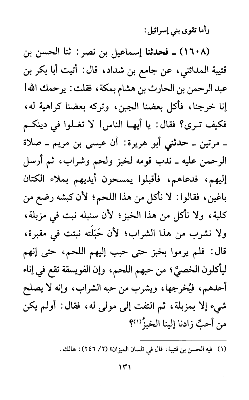 1608 - فحدثنا إسماعيل بن نصر: ثنا الحسن بن قتيبة المدائني، عن جامع بن شداد، قال: أتيت أبا بكر بن عبد الرحمن بن الحارث بن هشام بمكة، فقلت: يرحمك الله! إنا خرجنا، فأكل بعضنا الجبن، وتركه بعضنا كراهية له، فكيف ترى؟ فقال: يا أيها الناس! لا تغلوا في دينكم -مرتين- حدثني أبو هريرة: أن عيسى بن مريم -صلاة الرحمن عليه- ندب قومه لخبز ولحم وشراب، ثم أرسل إليهم، فدعاهم، فأقبلوا يمسحون أيديهم بملاء الكتان باغين، فقالوا: لا نأكل من هذا اللحم؛ لأن كبشه رضع من كلبة، ولا نأكل من هذا الخبز؛ لأن سنبله نبت في مزبلة، ولا نشرب من هذا الشراب؛ لأن حبلته نبتت في مقبرة، قال: فلم يرموا بخبز حتى حبب إليهم اللحم، حتى إنهم ليأكلون الخصي؛ من حبهم اللحم، وإن الفويسقة تقع في إناء أحدهم، فيخرجها، ويشرب من حبه الشراب، وإنه لا يصلح شيء إلا بمزبلة، ثم التفت إلى مولى له، فقال: أو لم يكن من أحب زادنا إلينا الخبز؟.