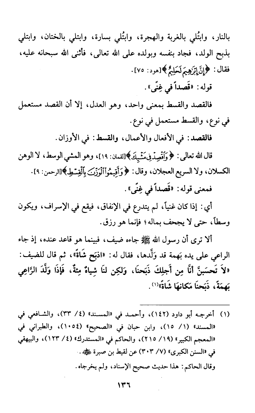 ألا ترى أن رسول الله صلى الله عليه وسلم جاءه ضيف، فبينما هو قاعد عنده، إذ جاء الراعي على يده بهمة قد ولدها، فقال له: ((اذبح شاةً))، ثم قال للضيف: ((لا تحسبن أنا من أجلك ذبحنا، ولكن لنا شياهٌ مئةٌ، فإذا ولد الراعي بهمةً، ذبحنا مكانها شاةً)).
