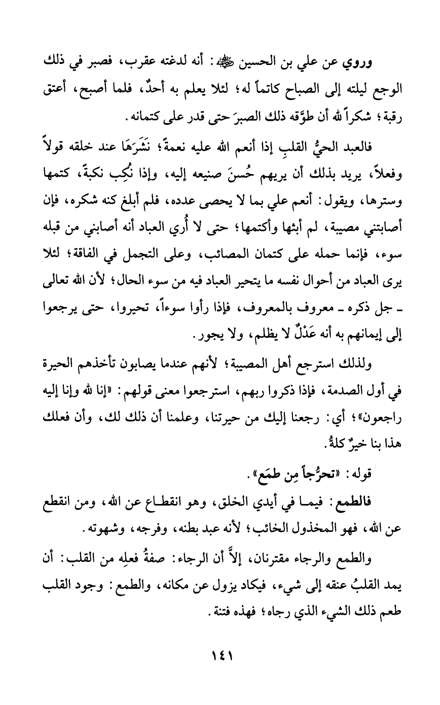 وروي عن علي بن الحسين رضي الله عنه: أنه لدغته عقرب، فصبر في ذلك الوجع ليلته إلى الصباح كاتماً له؛ لئلا يعلم به أحدٌ، فلما أصبح، أعتق رقبة؛ شكراً لله أن طوقه ذلك الصبر حتى قدر على كتمانه.