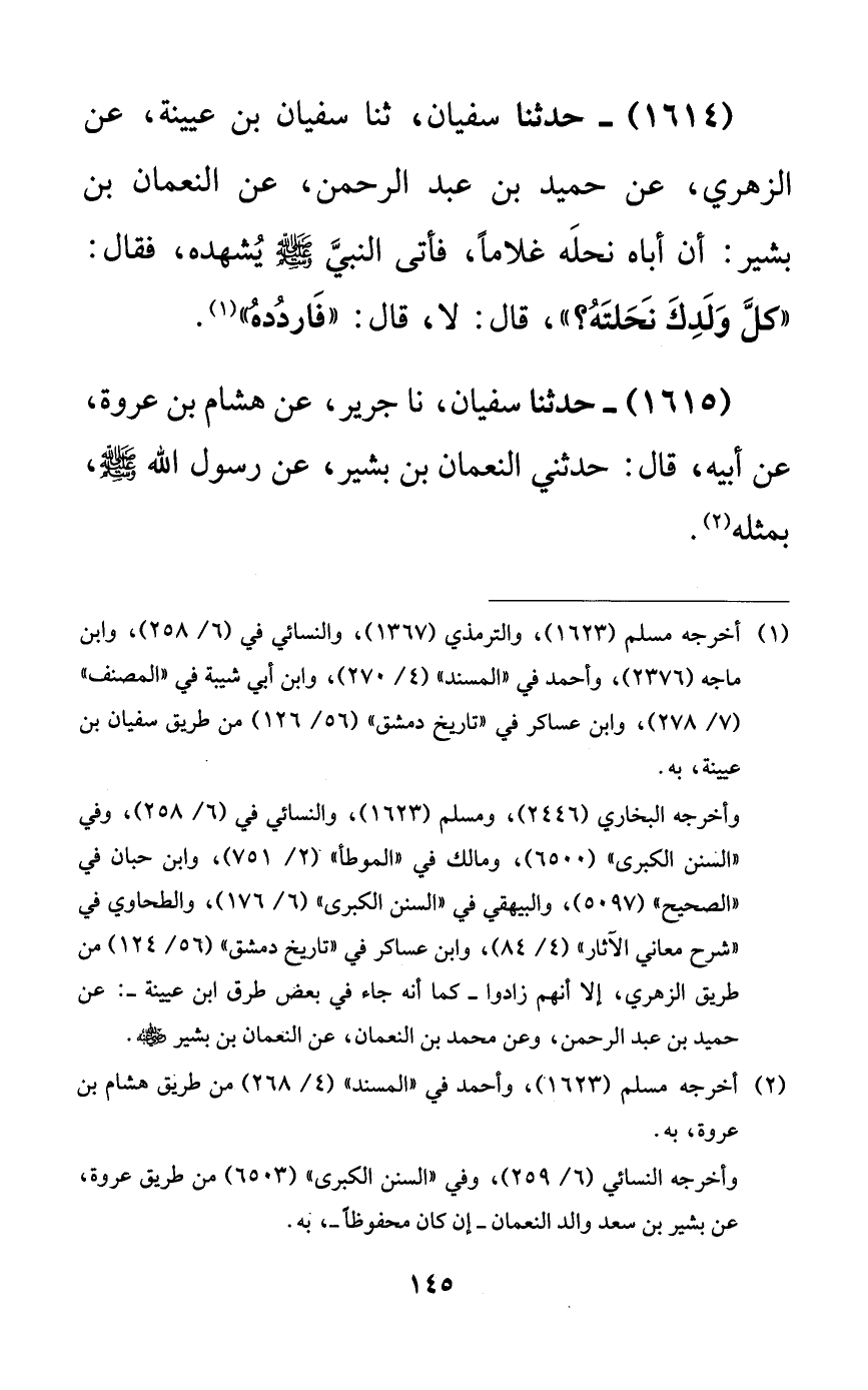 1614 - حدثنا سفيان، ثنا سفيان بن عيينة، عن الزهري، عن حميد بن عبد الرحمن، عن النعمان بن بشير: أن أباه نحله غلاماً، فأتى النبي صلى الله عليه وسلم يشهده، فقال: ((كل ولدك نحلته؟))، قال: لا، قال: ((فاردده)).