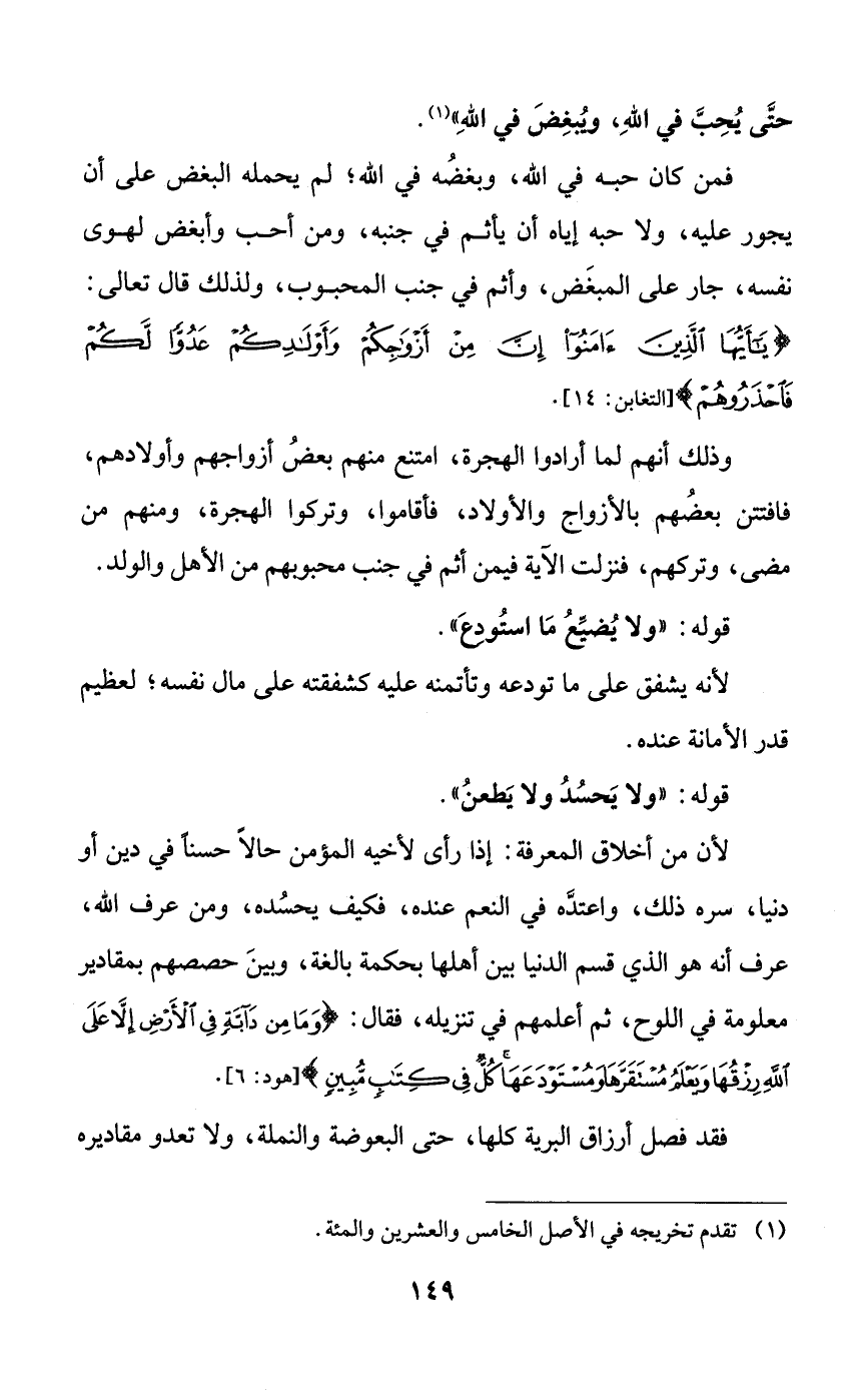 فمن كان حبه في الله، وبغضه في الله؛ لم يحمله البغض على أن يجور عليه، ولا حبه إياه أن يأثم في جنبه، ومن أحب وأبغض لهوى نفسه، جار على المبغض، وأثم في جنب المحبوب، ولذلك قال تعالى: {يأيها الذين آمنوا إن من أزواجكم وأولادكم عدوًّا لكم فاحذروهم}.