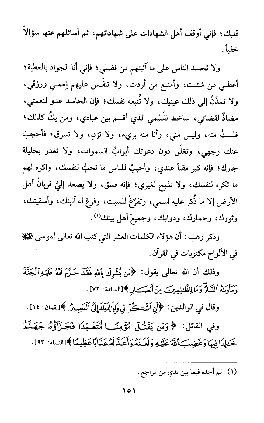 ولا تحسد الناس على ما آتيتهم من فضلي؛ فإني أنا الجواد بالعطية؛ أعطي من شئت، وأمنع من أردت، ولا تنفس عليهم نعمي ورزقي، ولا تمدن إلى ذلك عينيك، ولا تتبعه نفسك؛ فإن الحاسد عدو لنعمتي، مضادٌّ لقضائي، ساخط لقسمي الذي أقسم بين عبادي، ومن يك كذلك؛ فلست منه، وليس مني، وأنا منه بريء، ولا تزن، ولا تسرق؛ فأحجب عنك وجهي، وتغلق دون دعوتك أبواب السماوات، ولا تغدر بحليلة جارك؛ فإنه كبر مقتاً عندي، وأحبب للناس ما تحب لنفسك، واكره لهم ما تكره لنفسك، ولا تذبح لغيري؛ فإنه فسق، ولا يصعد إلي قربان أهل الأرض إلا ما ذكر عليه اسمي، وتفرغ للسبت، وفرغ له آنيتك، وأسقيتك، وثورك، وحمارك، ودوابك، وجميع أهل بيتك.