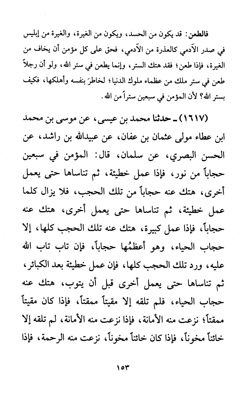 1617 - حدثنا محمد بن عيسى، عن موسى بن محمد ابن عطاء مولى عثمان بن عفان، عن عبيد الله بن راشد، عن الحسن البصري، عن سلمان، قال: المؤمن في سبعين حجاباً من نور، فإذا عمل خطيئة، ثم تناساها حتى يعمل أخرى، هتك عنه حجاباً من تلك الحجب، فلا يزال كلما عمل خطيئة، ثم تناساها حتى يعمل أخرى، هتك عنه حجاباً، فإذا عمل كبيرة، هتك عنه تلك الحجب كلها، إلا حجاب الحياء، وهو أعظمها حجاباً، فإن تاب تاب الله عليه، ورد تلك الحجب كلها، فإن عمل خطيئة بعد الكبائر، ثم تناساها حتى يعمل أخرى قبل أن يتوب، هتك عنه حجاب الحياء، فلم تلقه إلا مقيتاً ممقتاً، فإذا كان مقيتاً ممقتاً؛ نزعت منه الأمانة، فإذا نزعت منه الأمانة، لم تلقه إلا خائناً مخوناً، فإذا كان خائناً مخوناً، نزعت منه الرحمة، فإذا