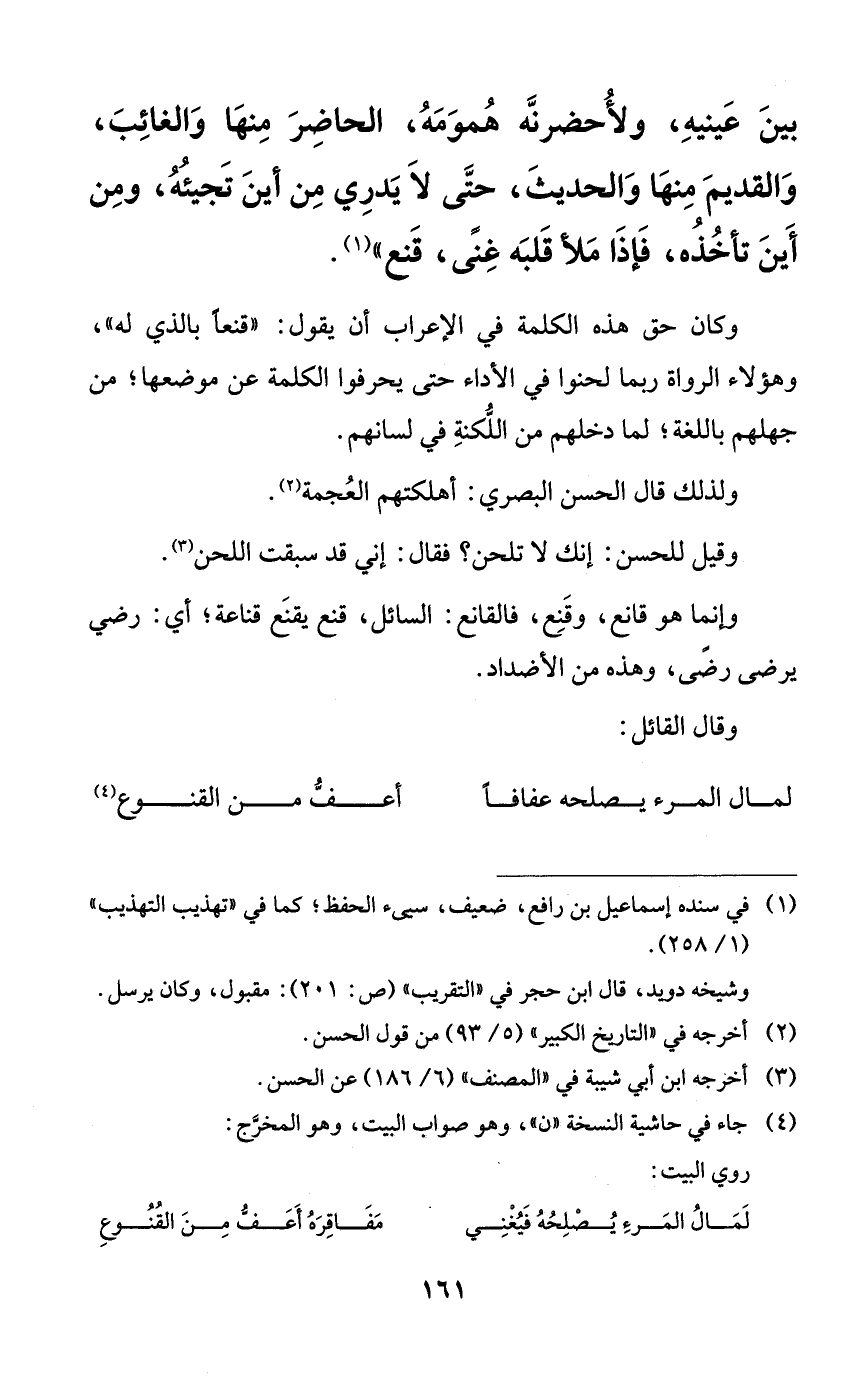 وكان حق هذه الكلمة في الإعراب أن يقول: ((قنعاً بالذي له))، وهؤلاء الرواة ربما لحنوا في الأداء حتى يحرفوا الكلمة عن موضعها؛ من جهلهم باللغة؛ لما دخلهم من اللكنة في لسانهم.