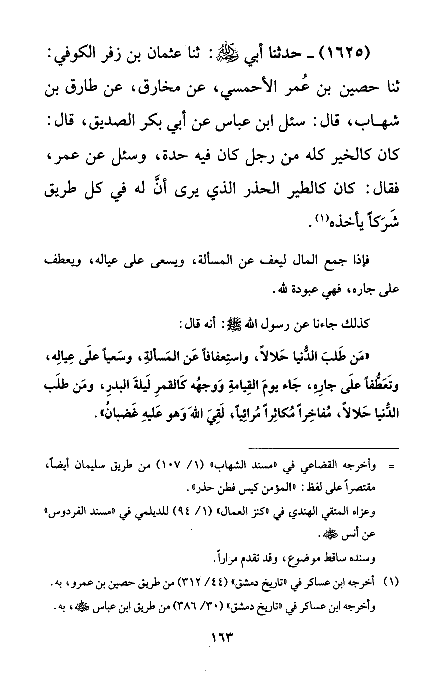 1625 - حدثنا أبي رحمه الله: ثنا عثمان بن زفر الكوفي: ثنا حصين بن عمر الأحمسي، عن مخارق، عن طارق بن شهاب، قال: سئل ابن عباس عن أبي بكر الصديق، قال: كان كالخير كله من رجل كان فيه حدة، وسئل عن عمر، فقال: كان كالطير الحذر الذي يرى أن له في كل طريق شركاً يأخذه.
