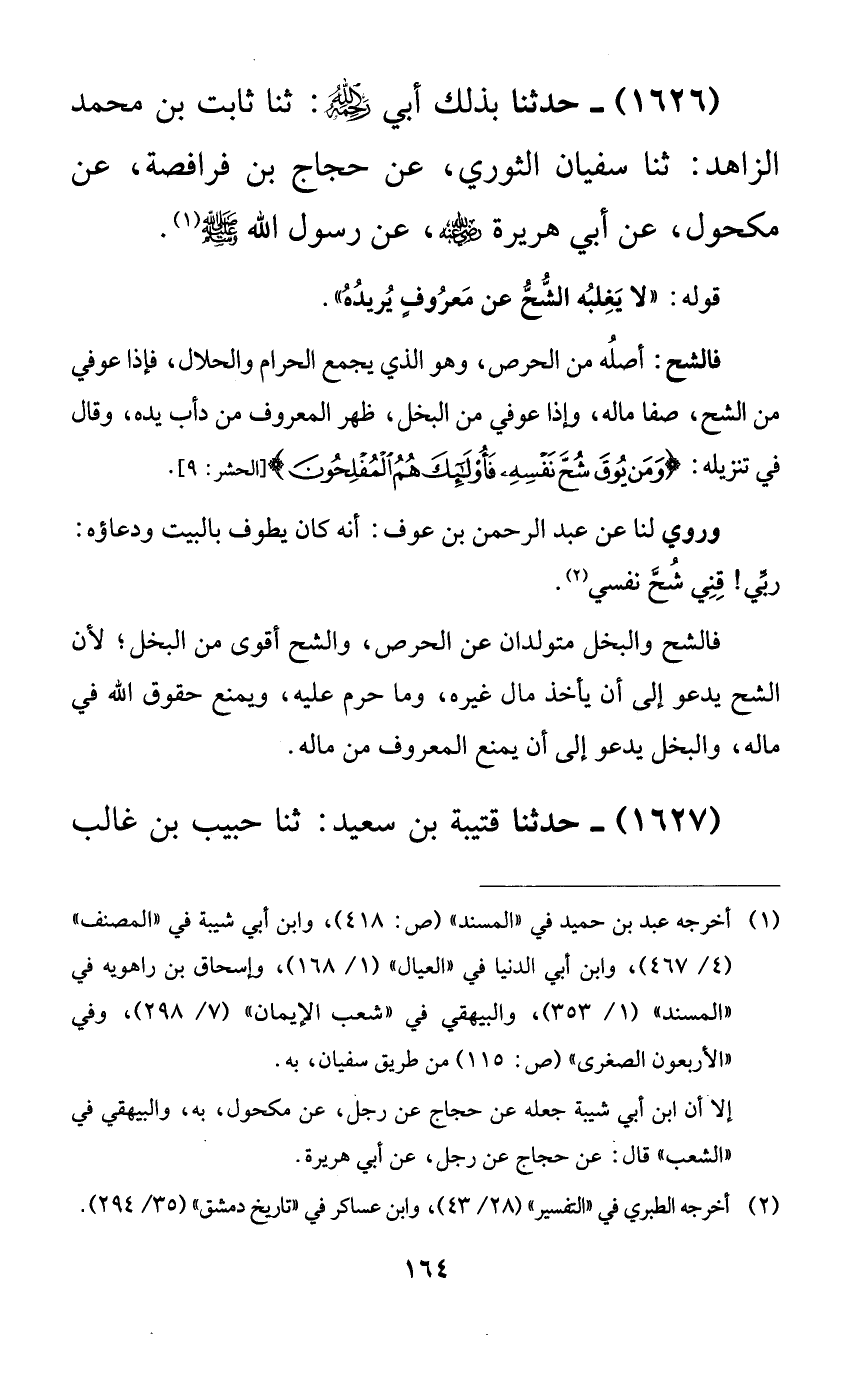 1626 - حدثنا بذلك أبي رحمه الله: ثنا ثابت بن محمد الزاهد: ثنا سفيان الثوري، عن حجاج بن فرافصة، عن مكحول، عن أبي هريرة رضي الله عنه، عن رسول الله صلى الله عليه وسلم.