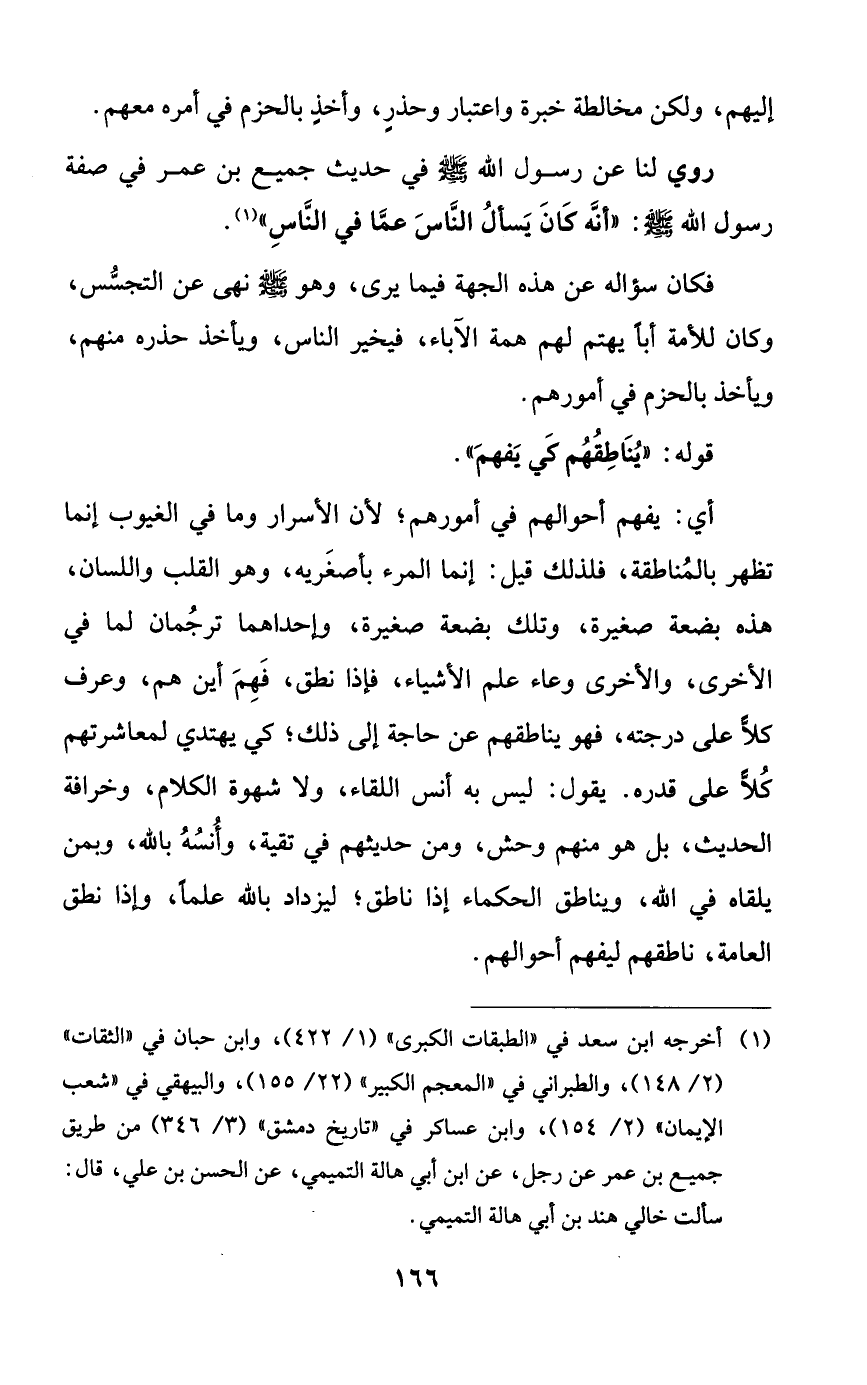 أي: يفهم أحوالهم في أمورهم؛ لأن الأسرار وما في الغيوب إنما تظهر بالمناطقة، فلذلك قيل: إنما المرء بأصغريه، وهو القلب واللسان، هذه بضعة صغيرة، وتلك بضعة صغيرة، وإحداهما ترجمان لما في الأخرى، والأخرى وعاء علم الأشياء، فإذا نطق، فهم أين هم، وعرف كلاًّ على درجته، فهو يناطقهم عن حاجة إلى ذلك؛ كي يهتدي لمعاشرتهم كلاًّ على قدره. يقول: ليس به أنس اللقاء، ولا شهوة الكلام، وخرافة الحديث، بل هو منهم وحش، ومن حديثهم في تقية، وأنسه بالله، وبمن يلقاه في الله، ويناطق الحكماء إذا ناطق؛ ليزداد بالله علماً، وإذا نطق العامة، ناطقهم ليفهم أحوالهم.