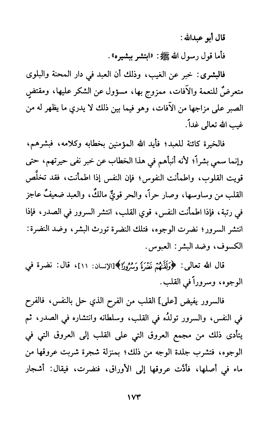 فالخيرة كائنة للعبد؛ فأيد الله المؤمنين بخطابه وكلامه، فبشرهم، وإنما سمي بشراً؛ لأنه أنبأهم في هذا الخطاب عن خبر نفى حيرتهم، حتى قويت القلوب، واطمأنت النفوس؛ فإن النفس إذا اطمأنت، فقد تخلص القلب من وساوسها، وصار حراً، والحر قويٌّ مالكٌ، والعبد ضعيفٌ عاجز في رتبة، فإذا اطمأنت النفس، قوي القلب، انتشر السرور في الصدر، فإذا انتشر السرور؛ نضرت الوجوه، فتلك النضرة تورث البشر، وضد النضرة: الكسوف، وضد البشر: العبوس.