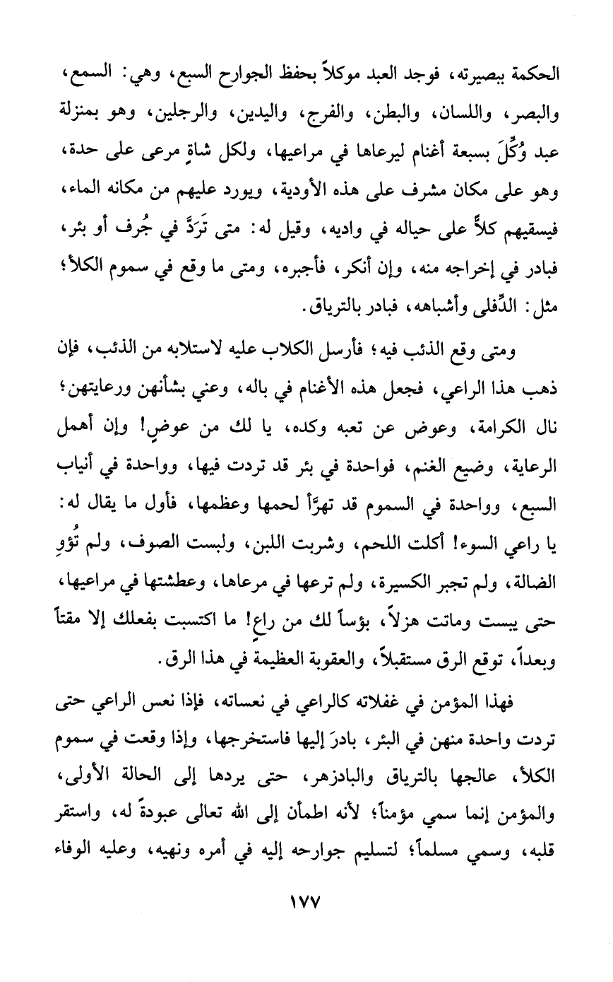 الحكمة ببصيرته، فوجد العبد موكلاً بحفظ الجوارح السبع، وهي: السمع، والبصر، واللسان، والبطن، والفرج، واليدين، والرجلين، وهو بمنزلة عبد وكل بسبعة أغنام ليرعاها في مراعيها، ولكل شاةٍ مرعى على حدة، وهو على مكان مشرف على هذه الأودية، ويورد عليهم من مكانه الماء، فيسقيهم كلاًّ على حياله في واديه، وقيل له: متى ترد في جرف أو بئر، فبادر في إخراجه منه، وإن أنكر، فأجبره، ومتى ما وقع في سموم الكلأ؛ مثل: الدفلى وأشباهه، فبادر بالترياق.