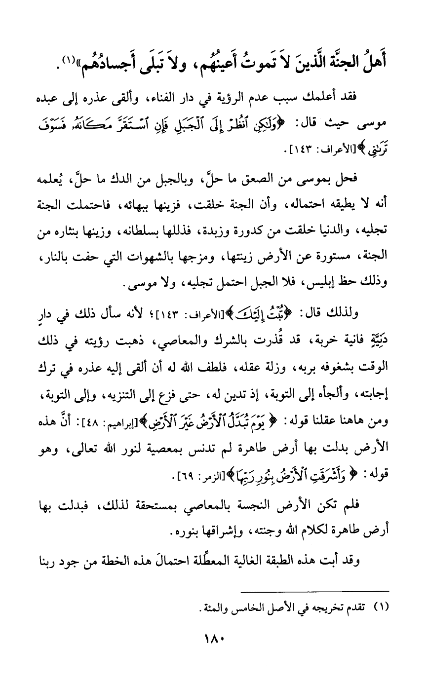 ولذلك قال: {تبت إليك}؛ لأنه سأل ذلك في دارٍ دنيةٍ فانية خربة، قد قذرت بالشرك والمعاصي، ذهبت رؤيته في ذلك الوقت بشغوفه بربه، وزلة عقله، فلطف الله له أن ألقى إليه عذره في ترك إجابته، وألجأه إلى التوبة، إذ تدين له، حتى فزع إلى التنزيه، وإلى التوبة، ومن هاهنا عقلنا قوله: {يوم تبدل الأرض غير الأرض}: أن هذه الأرض بدلت بها أرض طاهرة لم تدنس بمعصية لنور الله تعالى، وهو قوله: {وأشرقت الأرض بنور ربها}.
