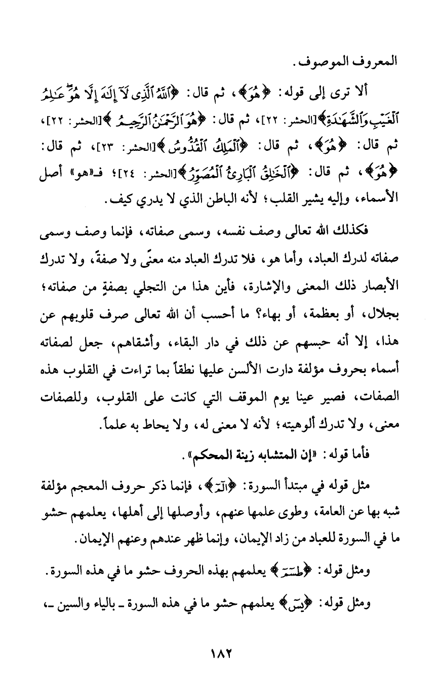ألا ترى إلى قوله: {هو}، ثم قال: {الله الذي لا إله إلا هو عالم الغيب والشهادة}، ثم قال: {هو الرحمن الرحيم}، ثم قال: {هو}، ثم قال: {الملك القدوس}، ثم قال: {هو}، ثم قال: {الخالق البارئ المصور}؛ فـ ((هو)) أصل الأسماء، وإليه يشير القلب؛ لأنه الباطن الذي لا يدري كيف.