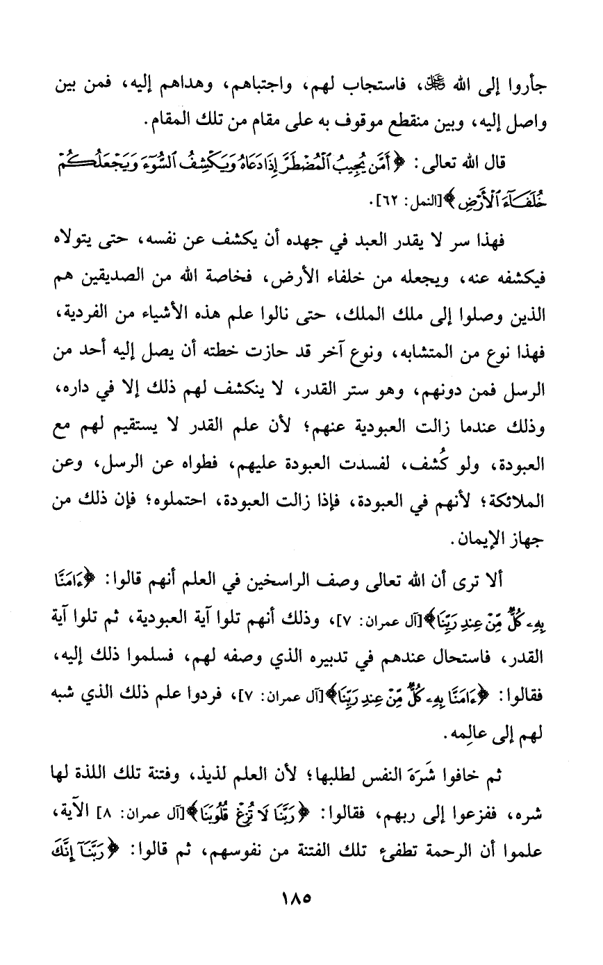 ألا ترى أن الله تعالى وصف الراسخين في العلم أنهم قالوا: {آمنا به كلٌّ من عند ربنا}، وذلك أنهم تلوا آية العبودية، ثم تلوا آية القدر، فاستحال عندهم في تدبيره الذي وصفه لهم، فسلموا ذلك إليه، فقالوا: {آمنا به كلٌّ من عند ربنا}، فردوا علم ذلك الذي شبه لهم إلى عالمه.