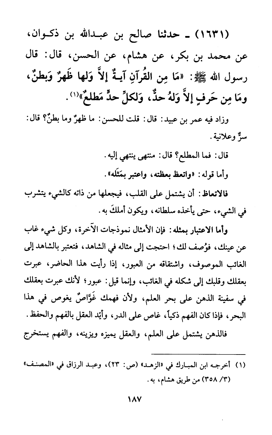 1631 - حدثنا صالح بن عبد الله بن ذكوان، عن محمد بن بكر، عن هشام، عن الحسن، قال: قال رسول الله صلى الله عليه وسلم: ((ما من القرآن آيةٌ إلا ولها ظهرٌ وبطنٌ، وما من حرفٍ إلا وله حدٌّ، ولكل حدٍّ مطلعٌ)).