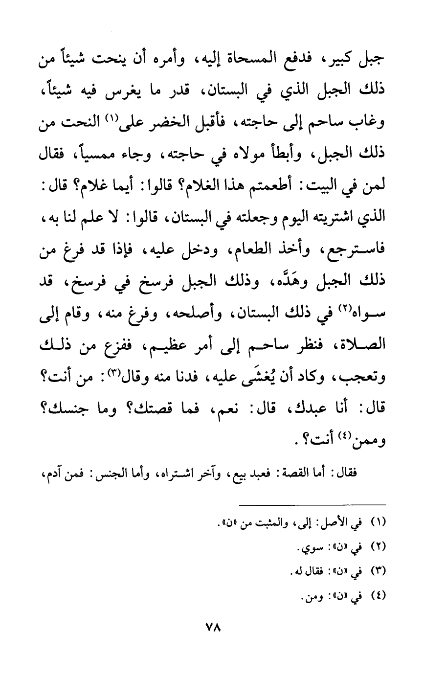 جبل كبير، فدفع المسحاة إليه، وأمره أن ينحت شيئاً من ذلك الجبل الذي في البستان، قدر ما يغرس فيه شيئاً، وغاب ساحم إلى حاجته، فأقبل الخضر على النحت من ذلك الجبل، وأبطأ مولاه في حاجته، وجاء ممسياً، فقال لمن في البيت: أطعمتم هذا الغلام؟ قالوا: أيما غلام؟ قال: الذي اشتريته اليوم وجعلته في البستان، قالوا: لا علم لنا به، فاسترجع، وأخذ الطعام، ودخل عليه، فإذا قد فرغ من ذلك الجبل وهده، وذلك الجبل فرسخ في فرسخ، قد سواه في ذلك البستان، وأصلحه، وفرغ منه، وقام إلى الصلاة، فنظر ساحم إلى أمر عظيم، ففزع من ذلك وتعجب، وكاد أن يغشى عليه، فدنا منه وقال: من أنت؟ قال: أنا عبدك، قال: نعم، فما قصتك؟ وما جنسك؟ وممن أنت؟.