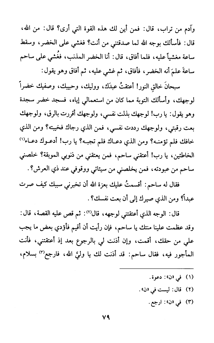 سبحان خالق النور! أعتقت عبدك، ووليك، وحبيبك، وصفيك خضراً لوجهك، وأسألك التوبة مما كان من استعمالي إياه، فسجد خضر سجدة وهو يقول: يا رب! لوجهك بذلت نفسي، ولوجهك أقررت بالرق، ولوجهك بعت رقبتي، ولوجهك رددت نفسي، فمن الذي رجاك فخيبته؟ ومن الذي خافك فلم تؤمنه؟ ومن الذي دعاك فلم تجبه؟ يا رب! أدعوك دعاء الخاطئين، يا رب! أعتقني ساحم، فمن يعتقني من ذنوبي الموبقة؟ خلصني ساحم من عبودته، فمن يخلصني من سيئاتي ووقوفي عند ذي العرش؟.
