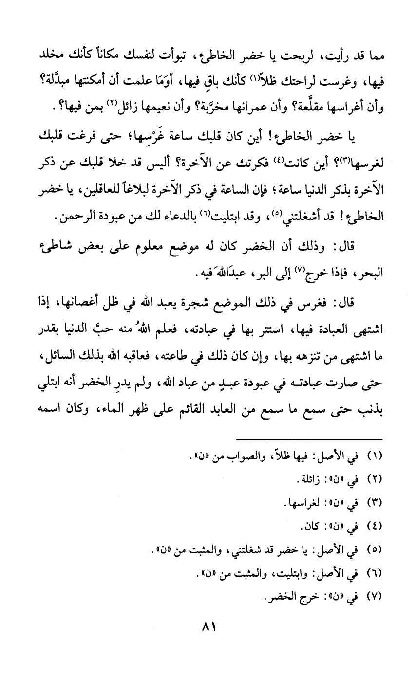 مما قد رأيت لربحت يا خضر الخاطئ، تبوأت لنفسك مكاناً كأنك مخلد فيها، وغرست لراحتك ظلاً كأنك باق فيها، أوَما علمت أن أمكنتها مبدلة؟ وأن أغراسها مقلعة؟ وأن عمرانها مخربة؟ وأن نعيمها زائل بمن فيها؟.