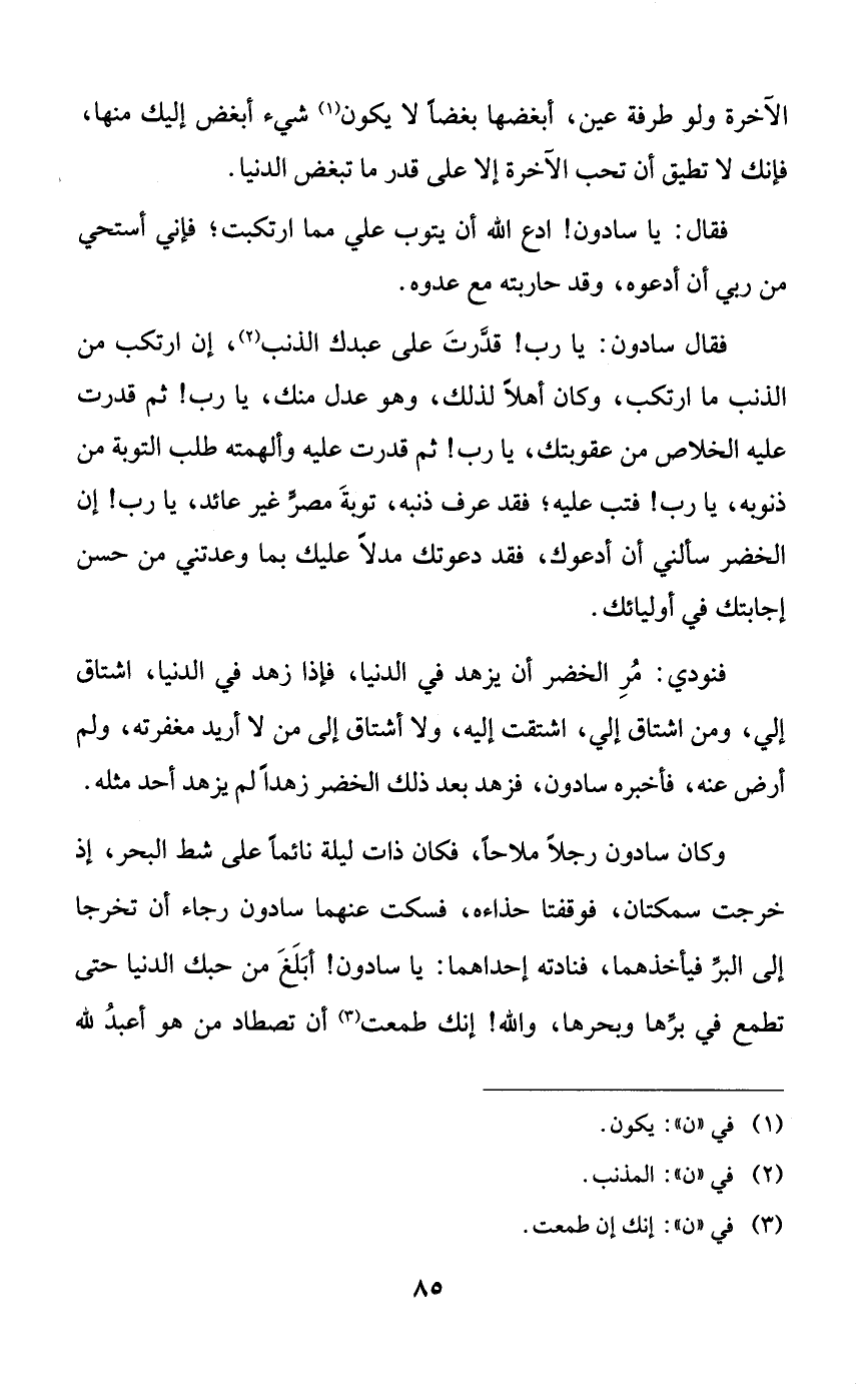 وكان سادون رجلاً ملاحاً، فكان ذات ليلة نائماً على شط البحر، إذ خرجت سمكتان، فوقفتا حذاءه، فسكت عنهما سادون رجاء أن تخرجا إلى البر فيأخذهما، فنادته إحداهما: يا سادون! أبلغ من حبك الدنيا حتى تطمع في برها وبحرها، والله! إنك طمعت أن تصطاد من هو أعبد لله