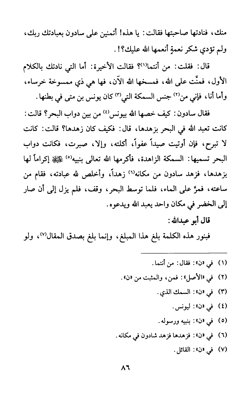 منك، فنادتها صاحبتها فقالت: يا هذه! أتمنين على سادون بعبادتك ربك، ولم تؤدي شكر نعمةٍ أنعمها الله عليك؟!.