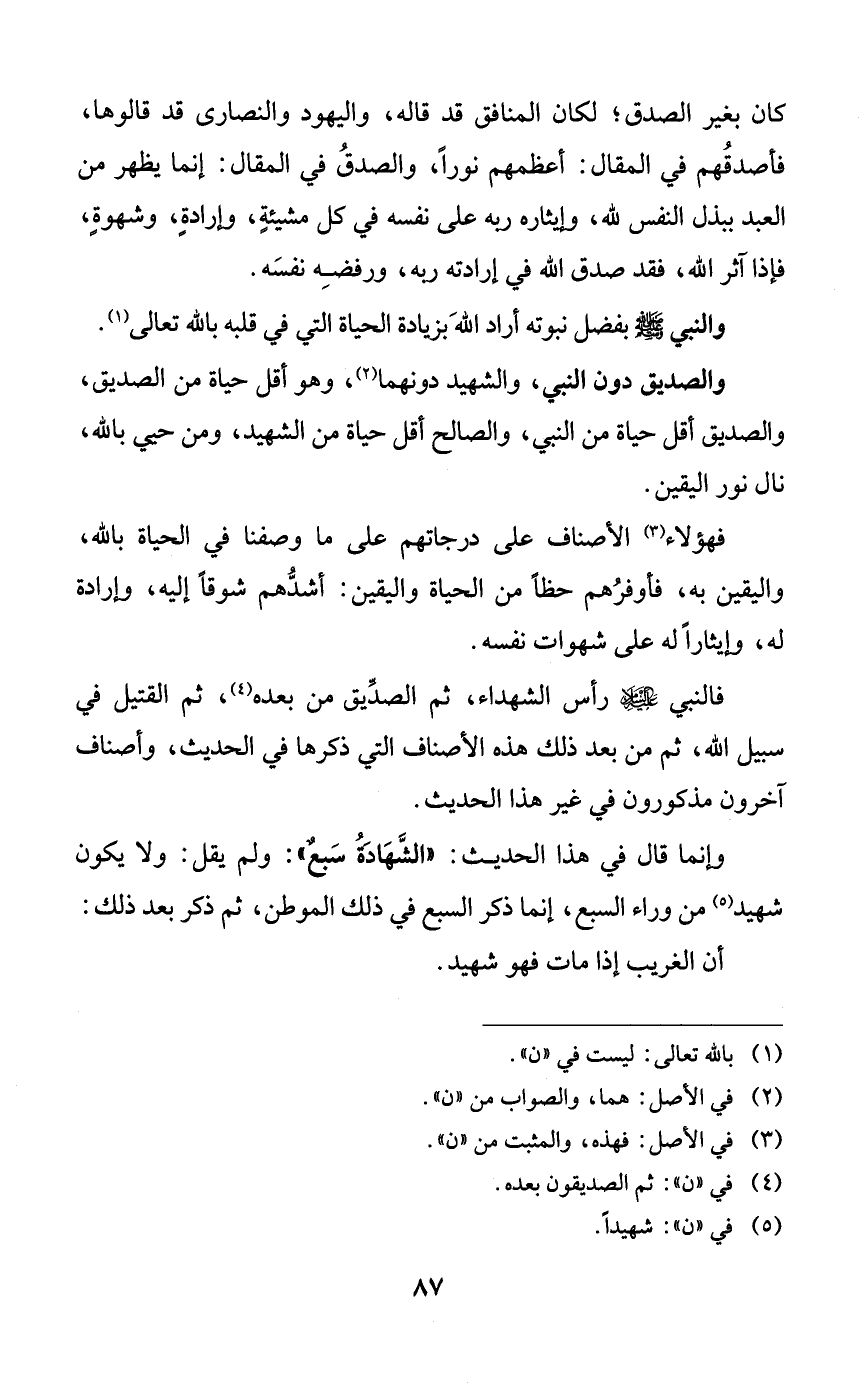 والصديق دون النبي، والشهيد دونهما، وهو أقل حياة من الصديق، والصديق أقل حياة من النبي، والصالح أقل حياة من الشهيد، ومن حيي بالله، نال نور اليقين.