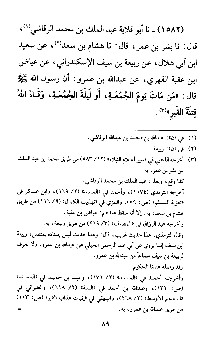 1582 - نا أبو قلابة عبد الملك بن محمد الرقاشي، قال: نا بشر بن عمر، قال: نا هشام بن سعد، عن سعيد ابن أبي هلال، عن ربيعة بن سيف الإسكندراني، عن عياض ابن عقبة الفهري، عن عبد الله بن عمرو: أن رسول الله صلى الله عليه وسلم قال: ((من مات يوم الجمعة، أو ليلة الجمعة، وقاه الله فتنة القبر)).