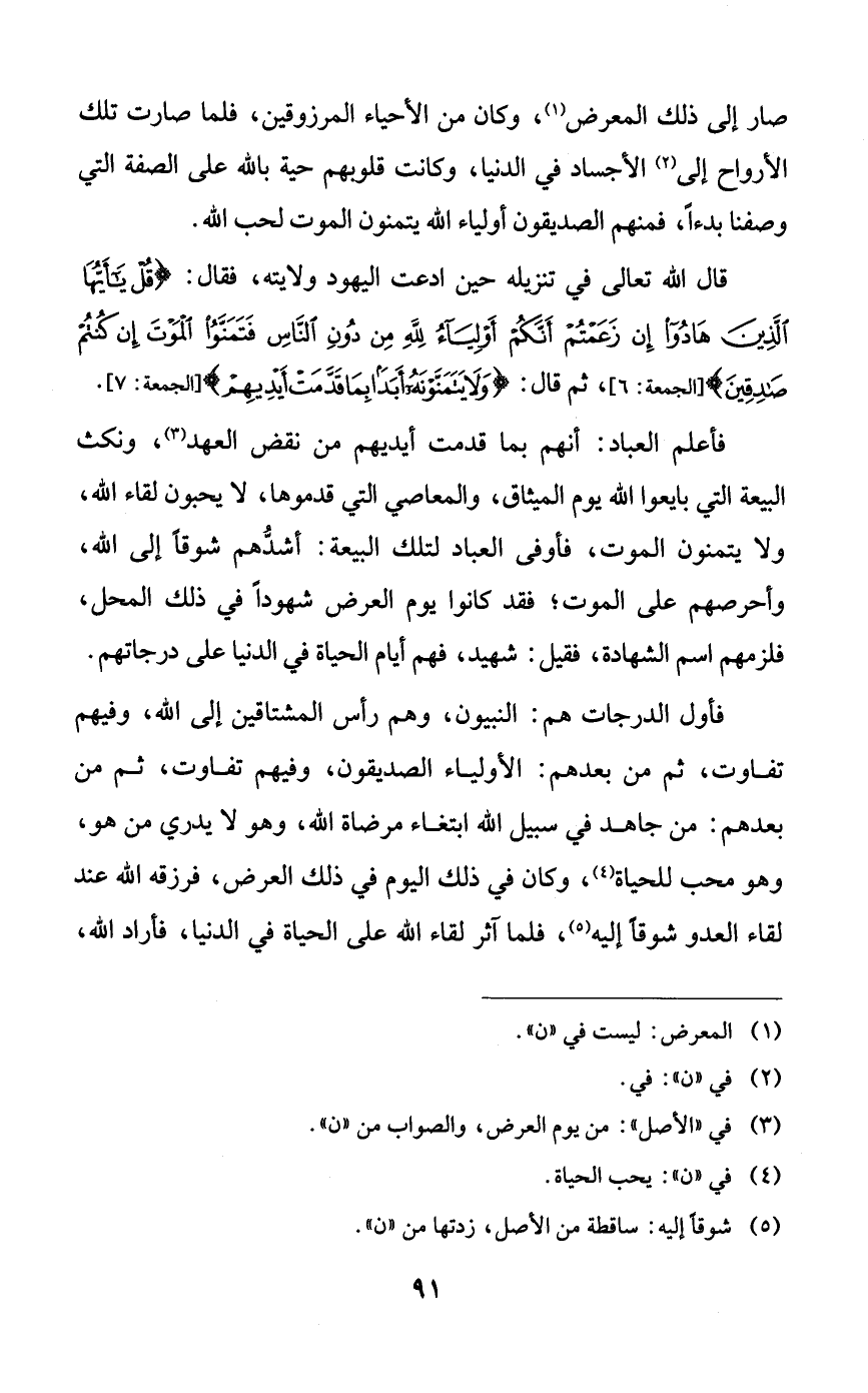 فأول الدرجات هم: النبيون، وهم رأس المشتاقين إلى الله، وفيهم تفاوت، ثم من بعدهم: الأولياء الصديقون، وفيهم تفاوت، ثم من بعدهم: من جاهد في سبيل الله ابتغاء مرضاة الله، وهو لا يدري من هو، وهو محب للحياة، وكان في ذلك اليوم في ذلك العرض، فرزقه الله عند لقاء العدو شوقاً إليه، فلما آثر لقاء الله على الحياة في الدنيا، فأراد الله،