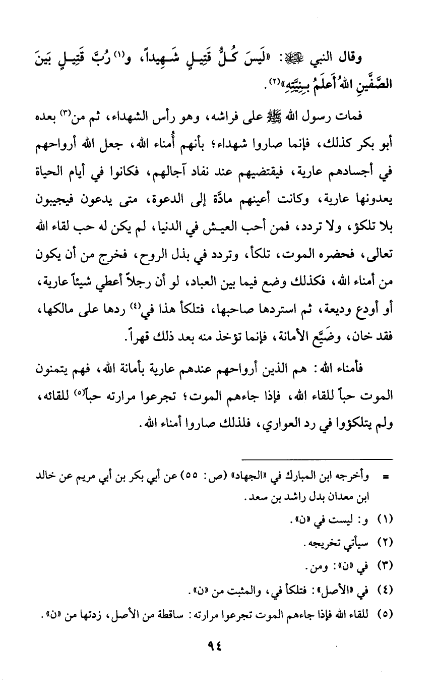 فمات رسول الله صلى الله عليه وسلم على فراشه، وهو رأس الشهداء، ثم من بعده أبو بكر كذلك، فإنما صاروا شهداء؛ بأنهم أمناء الله، جعل الله أرواحهم في أجسادهم عارية، فيقتضيهم عند نفاد آجالهم، فكانوا في أيام الحياة يعدونها عارية، وكانت أعينهم مادة إلى الدعوة، متى يدعون فيجيبون بلا تلكؤ، ولا تردد، فمن أحب العيش في الدنيا، لم يكن له حب لقاء الله تعالى، فحضره الموت، تلكأ، وتردد في بذل الروح، فخرج من أن يكون من أمناء الله، فكذلك وضع فيما بين العباد، لو أن رجلاً أعطي شيئاً عارية، أو أودع وديعة، ثم استردها صاحبها، فتلكأ هذا في ردها على مالكها، فقد خان، وضيع الأمانة، فإنما تؤخذ منه بعد ذلك قهراً.
